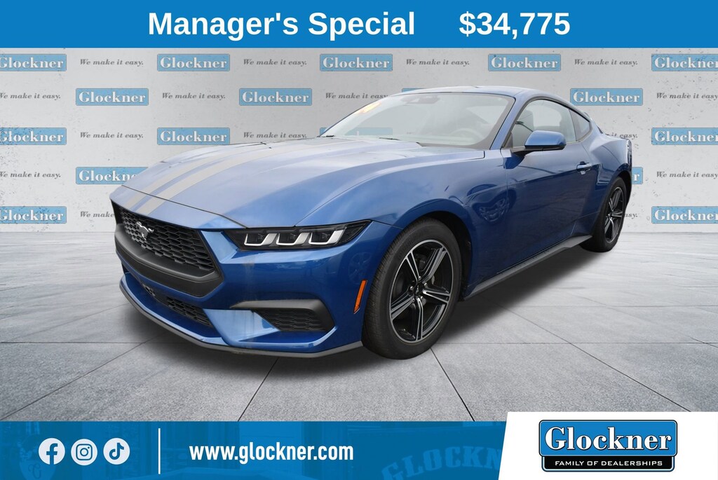 Glockner of Ironton is proud to offer this terrific 2024 Ford Mustang in Atlas Blue Metallic. This 2024 Ford Mustang has passed our comprehensive inspection and comes with the following features; Equipment Group 201A High Package (B&O Sound System by Bang & Olufsen, Illuminated Door-Sill Scuff Plates, Integrated Turn Signals, Leather-Trimmed Bucket Seats w/Color Accents, Memory Driver Seat & Mirrors, and Universal Garage Door Opener (UGDO)), Ford Co-Pilot360 Assist+ (Adaptive Speed Control w/Stop & Go, Connected Built-In Navigation, Lane-Keeping System w/Lane Keeping Aid, and Pre-Collision Assist w/Automatic Emergency Braking), Security Package (Active Anti-Theft System, Locking Center Console, and Wheel Locking Kit), Glockner Certified Certified, 4-Wheel Disc Brakes, 9 Speakers, ABS brakes, Active Valve Performance Exhaust, ActiveX Bucket Seats, Air Conditioning, Alloy wheels, AM/FM radio: SiriusXM with 360L, AM/FM Stereo, Auto High-beam Headlights, Auto-dimming Rear-View mirror, Automatic temperature control, Brake assist, Bumpers: body-color, Climate Controlled Heated/Cooled Front Seats, Compass, Delay-off headlights, Driver door bin, Driver vanity mirror, Dual front impact airbags, Dual front side impact airbags, Electronic Stability Control, Emergency communication system: 911 Assist, Exterior Parking Camera Rear, Four wheel independent suspension, Front anti-roll bar, Front Bucket Seats, Front Center Armrest, Front dual zone A/C, Front reading lights, Fully automatic headlights, Gloss Gray/Semi-Gloss Black Stripe, HD Radio, Heated door mirrors, Heated front seats, Heated steering wheel, Illuminated entry, Knee airbag, Leather Shift Knob, Leather steering wheel, Low tire pressure warning, Occupant sensing airbag, Outside temperature display, Over-the-Top Racing Stripe, Overhead airbag, Overhead console, Panic alarm, Passenger door bin, Passenger vanity mirror, Power door mirrors, Power driver seat, Power passenger seat, Power steering, Power windows, Premium Floor Liners Front & Rear (w/Carpet Mats), Premium Floor Mats w/Metal Gray Accent Stitch, Radio data system, Rain sensing wipers, Real Stitch Instrument Panel, Rear anti-roll bar, Rear Parking Sensors, Rear window defroster, Remote keyless entry, SiriusXM w/360L, Speed control, Speed-sensing steering, Speed-Sensitive Wipers, Split folding rear seat, Spoiler, Sport steering wheel, Steering wheel mounted audio controls, SYNC 4.0 QNX, Tachometer, Telescoping steering wheel, Tilt steering wheel, Traction control, Trip computer, Turn signal indicator mirrors, Variably intermittent wipers, Ventilated front seats, Voltmeter, and Wheels: 18 x 8 Machined-Face Aluminum.