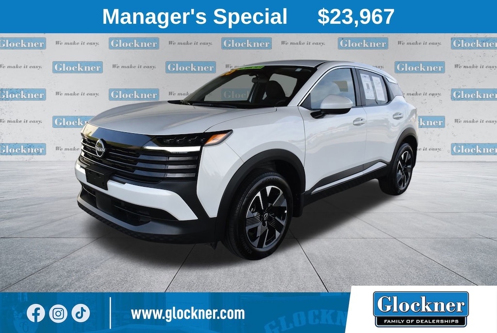 Glockner of Ironton is proud to offer this good-looking 2025 Nissan Kicks in Aspen White Tricoat. This 2025 Nissan Kicks has passed our comprehensive inspection and comes with the following features; Glockner Certified Certified, 17 Alloy Wheels, 4 Speakers, 4-Wheel Disc Brakes, ABS brakes, Air Conditioning, Alloy wheels, AM/FM radio: Sirius, Auto High-beam Headlights, Blind Spot Warning, Brake assist, Bumpers: body-color, Carpeted Floor Mats, Cloth Seat Trim, Driver door bin, Driver vanity mirror, Dual front impact airbags, Dual front side impact airbags, Electronic Stability Control, Four wheel independent suspension, Front anti-roll bar, Front Bucket Seats, Front Center Armrest, Front reading lights, Fully automatic headlights, Heated door mirrors, Illuminated entry, Knee airbag, Low tire pressure warning, Occupant sensing airbag, Outside temperature display, Overhead airbag, Panic alarm, Passenger door bin, Passenger vanity mirror, Power door mirrors, Power steering, Power windows, Premium Paint, Radio data system, Radio: AM/FM Audio System, Rear anti-roll bar, Rear Parking Sensors, Rear reading lights, Rear side impact airbag, Rear window defroster, Rear window wiper, Remote keyless entry, Security system, Speed control, Speed-sensing steering, Splash Guards, Split folding rear seat, Spoiler, Sport steering wheel, Steering wheel mounted audio controls, Tachometer, Telescoping steering wheel, Tilt steering wheel, Traction control, Trip computer, Variably intermittent wipers, and Wireless Apple CarPlay/Wireless Android Auto.