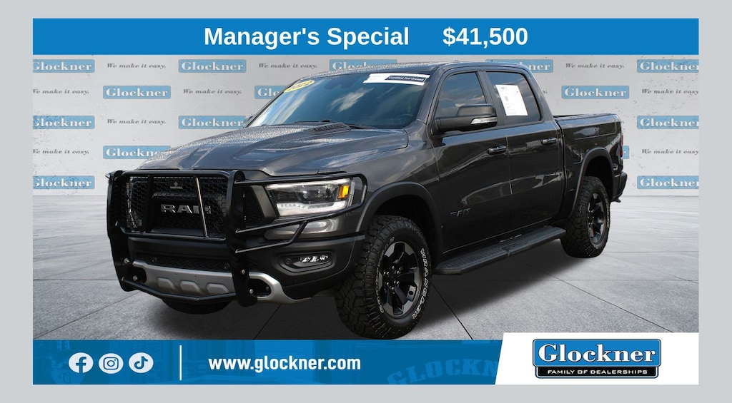 Glockner Chevrolet is proud to offer this beautiful 2022 Ram 1500 in Granite Crystal Metallic Clearcoat. This 2022 Ram 1500 has passed our comprehensive inspection and comes with the following features; Bed Utility Group (MOPAR 4 Adjustable Cargo Tie-Down Hooks and Pick-Up Box Lighting), Comfort/Convenience Group (Driver Seat Memory, Exterior Mirrors w/Memory, Heated Second Row Seats, Power 2-Way Passenger Lumbar Adjust, Power 8-Way Driver & Passenger Seats, Remote Tailgate Release, and Wireless Charging Pad), G/T Package (4 Way Front Headrests, Bucket Seats, Floor Console, Front Door Accent Lighting, Front Seat Back Map Pockets, G/T Decal, GT Interior Theme, Heated Front Seats, Heated Steering Wheel, Leather Wrapped Shift Knob, Leather-Wrapped Steering Wheel, Leather/Vinyl Bucket Seats, LED Dome Lamp w/On/Off Switch, LED Footwell Lighting, MOPAR Bright Pedal Kit, MOPAR Cold Air Intake System, Overhead LED Lamps, Passive Cold End Exhaust, Power 4-Way Driver Lumbar Adjust, Power 4-Way Passenger Lumbar Adjust, Power Adjustable Pedals w/Memory, Premium Overhead Console, Radio/Driver Seat/Mirrors/Pedals Memory, Rear 60/40 Folding Seat, Rear Door Accent Lighting, Steering Wheel Mounted Shift Control, Twill Film Appliques, Under Seat Lighting, and Ventilated Front Seats), Quick Order Package 27W Rebel, Rebel 12 (12 Touchscreen Display, 4G LTE Wi-Fi Hot Spot, Air Conditioning ATC w/Dual Zone Control, All R1 High Radios, All Radio Equipped Vehicles, Apple CarPlay, Connected Travel & Traffic Services, Connectivity - US/Canada, Disassociated Touchscreen Display, For Details, Visit DriveUconnect.com, Full Length Upgraded Floor Console, Global Telematics Box Module (TBM), Google Android Auto, GPS Antenna Input, GPS Navigation, harman/kardon 19 Speaker Premium Sound, HD Radio, Integrated Center Stack Radio, Integrated Voice Command w/Bluetooth, Lux Leather Trimmed Bucket Seats, Off-Road Information Pages, Power 2-Way Driver Lumbar Adjust, Radio: Uconnect 5 Nav w/12.0 Display, SiriusXM Radio Service, SiriusXM w/360L, and USB Host Flip), Rebel Level B Equipment Group (DISC) (115V Auxiliary Rear Power Outlet, 2-Door Passive Entry, Front Door Locks, 8.4 Touchscreen Display, Auto-Dimming Exterior Driver Mirror, Black Premium Power Mirrors (GUL), Bluetooth Handsfree Phone & Audio, Body Color Door Handles, Exterior Mirrors Courtesy Lamps, Exterior Mirrors w/Supplemental Signals, Foam Bottle Insert (Door Trim Panel), For More Info, Call 800-643-2112, Media Hub w/2 Charge Only USBs, ParkSense Front/Rear Park Assist w/Stop, Power Adjustable Pedals, Radio: Uconnect 5 W w/8.4 Display, Rain Sensitive Windshield Wipers, Rear Dome w/On/Off Switch Lamp, Rear Underseat Compartment Storage, Rear Window Defroster, Remote Start System, Security Alarm, SiriusXM Satellite Radio, Sun Visors w/Illuminated Vanity Mirrors, and Universal Garage Door Opener), 1500 Rebel, Glockner Certified Certified, 4D Crew Cab, HEMI 5.7L V8 Multi Displacement VVT, 4WD, Dome Dual LED Reading Lamp, Dual-Pane Panoramic Sunroof, 2nd Row In Floor Storage Bins, 3.92 Rear Axle Ratio, 33 Gallon Fuel Tank, 4-Wheel Disc Brakes, 48V Belt Starter Generator, 6 Speakers, ABS brakes, Air Conditioning, Alloy wheels, AM/FM radio: SiriusXM, Auto-dimming Rear-View mirror, Black Exterior Mirrors, Brake assist, Cloth/Vinyl Low Back Bucket Seats, Compass, Convex Wide-Angle Mirror Insert, Delay-off headlights, Driver door bin, Dual front impact airbags, Dual front side impact airbags, Electric Shift-On-Demand Transfer Case, Electronic Stability Control, Emergency communication system: SiriusXM Guardian, Exterior 115V AC Outlet, Front anti-roll bar, Front Bucket Seats, Front Center Armrest w/Storage, Front fog lights, Front License Plate Bracket, Front reading lights, Front wheel independent suspension, Fully automatic headlights, Heated door mirrors, Illuminated entry, Leather steering wheel, Low tire pressure warning, Mopar Black Tubular Side Steps, MOPA